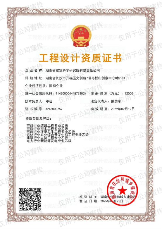 院属全资子公司--湖南省建设工程质量检测中心为全国建设工程质量检测行业先进单位,首批中国建筑业协会工程质量检测 AAA 级信用机构、国家级装配式建筑科技创新基地、湖南省绿色建材标识评价检测支撑单位。中心共获得经湖南省质量技术监督部门计量资质认定的各类共计 4871 项检验检测参数,并取得中国合格评定国家认可委员会实验室认可。中心目前具有建设部门授予的地基基础工程、主体结构工程、钢结构工程、见证取样和建筑幕墙等全能力检测资质,同时具备交通丙级资质、人防工程防护设备质量检测机构资质、司法鉴定许可资质和雷电防护装置检测资质。
